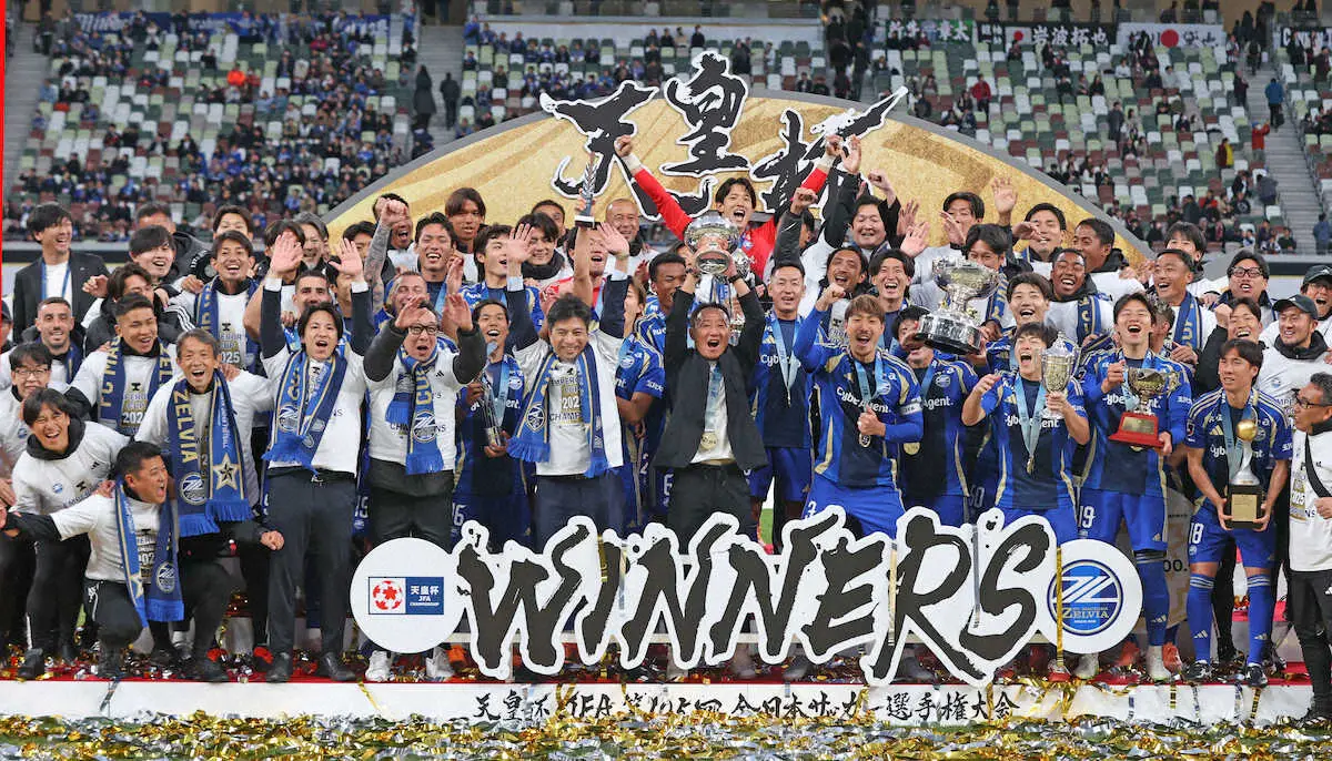 サッカー史の常識を覆し、新たな歴史の扉を開いた。黒田監督にとっては青森山田高時代に何度も戦った国立の舞台。試合終了の笛が鳴るとベンチで歓喜の輪が広がり、優勝インタビューでは先人たちに感謝しながら喜びに浸った。「1989年から約37年をかけて東京都4部からはい上がってきた。その皆さんの思いが一つになって戦えた」。セレモニーではカップを誇らしげに掲げ、自然と笑みがこぼれた。