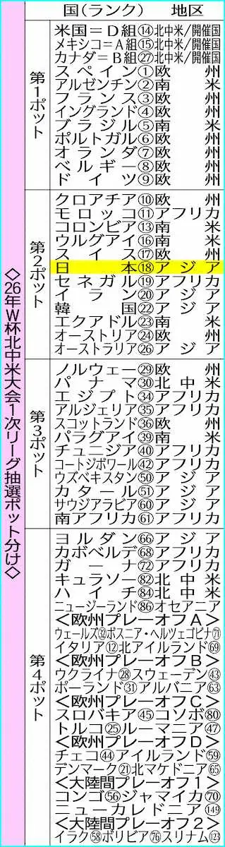 国際サッカー連盟(FIFA)は25日、12月5日(日本時間6日)に米国で行われる26年W杯北中米大会の組み合わせ抽選の詳細を発表した。出場チームを4段階に格付けするポット分けで、世界ランク18位の日本は第2ポットに入った。また、FIFAランク上位4カ国は1次リーグを首位通過した場合、準決勝まで対戦を避けられる方式が今大会から初めて導入される。