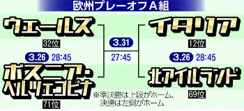 W杯で優勝4回を誇るイタリアは過去2大会連続で欧州予選プレーオフ敗退。3大会ぶりの出場を目指し臨んだ今大会の欧州予選ではノルウェーに敗れるなど2位。W杯切符の行方はまたしてもプレーオフまでもつれることになった。