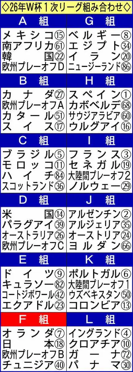 最注目の組は、前回準優勝のフランスとノルウェーが同居するI組。エムバペと怪物ハーランドによるバロンドール決定戦とも言えるスター対決が序盤から実現する。イタリアは欧州POを勝ち抜けばB組でカナダ、スイス、カタールと同組。ここが1次リーグ突破オッズでは唯一PO勝者が1番人気の“天国組”となった。