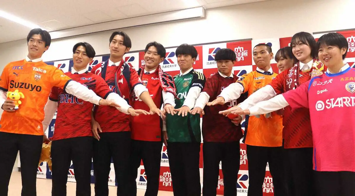 合同内定者会見に臨む流通経大柏の(左から)榎本雅大監督、水戸内定MF安藤晃希、水戸内定MF島谷義進、磐田内定DF増田大空、東京V内定FW大藤颯太 Photo by スポニチ 流通経大サッカー部が内定会見 大学選抜10番でフィオレンティナ撃破のFW… ギャラリーで見る この記事のフォト 2025年12月08日の画像一覧 もっと見る 2025年12月08日の画像をもっと見る