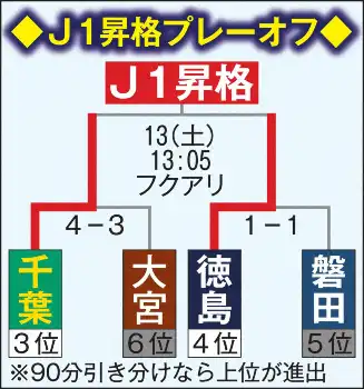 千葉(J2・3位)は大宮(同6位)に0―3とリードを許しながらも後半26分から16分間で4点を奪って4―3の逆転で勝利し、決勝に進出した。2―3の後半38分、この日がプロ初出場のU―17日本代表MF姫野誠(17)がデビュー弾となる同点ゴール。アカデミー育ちの有望株が途中出場から流れを変え、17年ぶりのJ1復帰へ王手をかけた。徳島(同4位)と磐田(同5位)は1―1で引き分け、規定によりリーグ戦上位の徳島が勝ち進んだ。決勝は13日にフクダ電子アリーナで行われる。