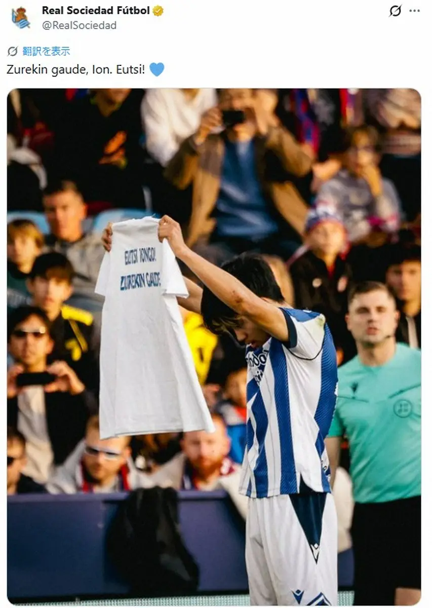 ゴール直後には久保が味方サポーターの元へと駆け寄り両手を合わせ“謝罪ポーズ”。さらにスペイン語で「私たちは君とともにいる。強くあれ」といったメッセージが書かれたTシャツを掲げる場面があった。このTシャツについて地元紙ノティシアス・デ・ギプスコアは「今週、重い病気であることが判明したチームの栄養士に向けたメッセージだった」と報じていた。