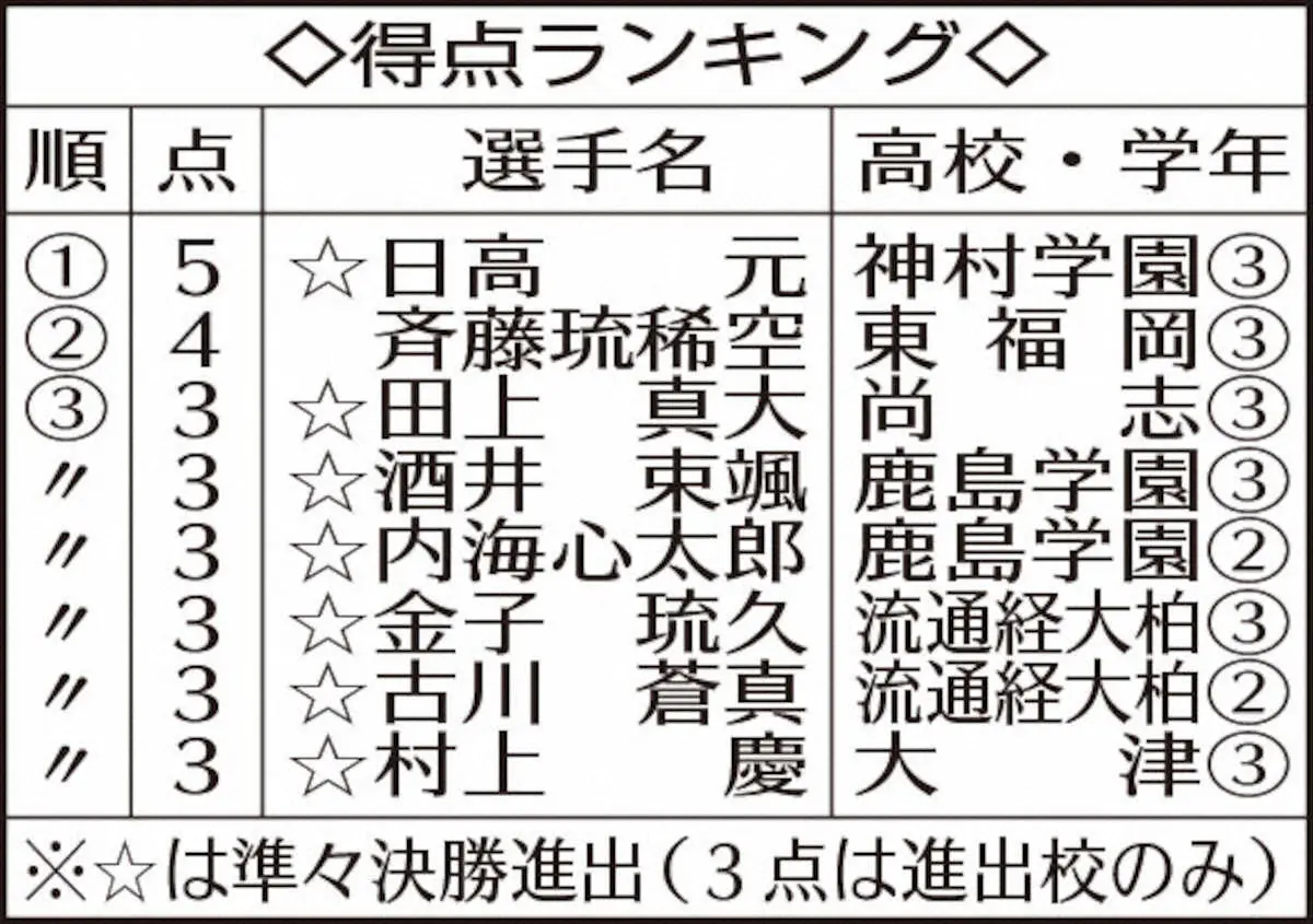 神村学園のFW日高元(3年)が2ゴールの活躍で得点ランクの単独トップに立った。後半6分に右サイドからのパスを左足で蹴り込むと、同18分には左からのクロスをダイビングヘッド。ハットトリックを達成した初戦2回戦の東海学園(愛知)戦に続く複数得点で、通算ゴール数を5に伸ばした。