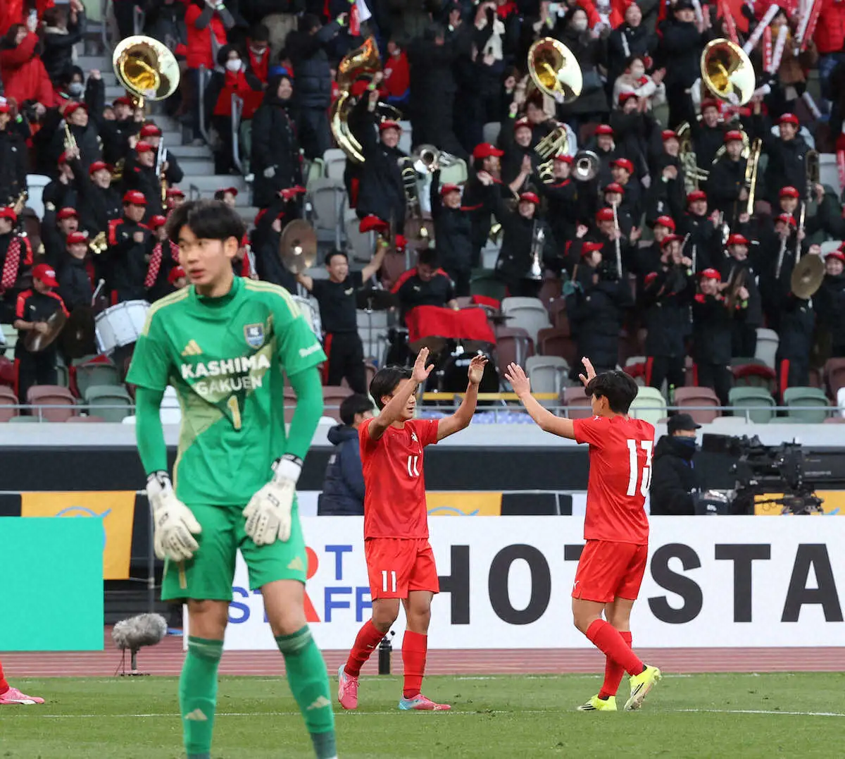 <神村学園×鹿島学園>前半、ゴールを決め喜ぶ神村学園・日高(左から2人目)(撮影・西海健太郎)