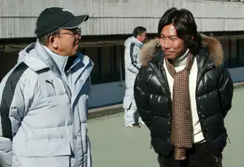 取材に訪れたOBの前園真聖氏(右)と話し込む鹿児島実の松沢隆司総監督(2006年1月撮影)
