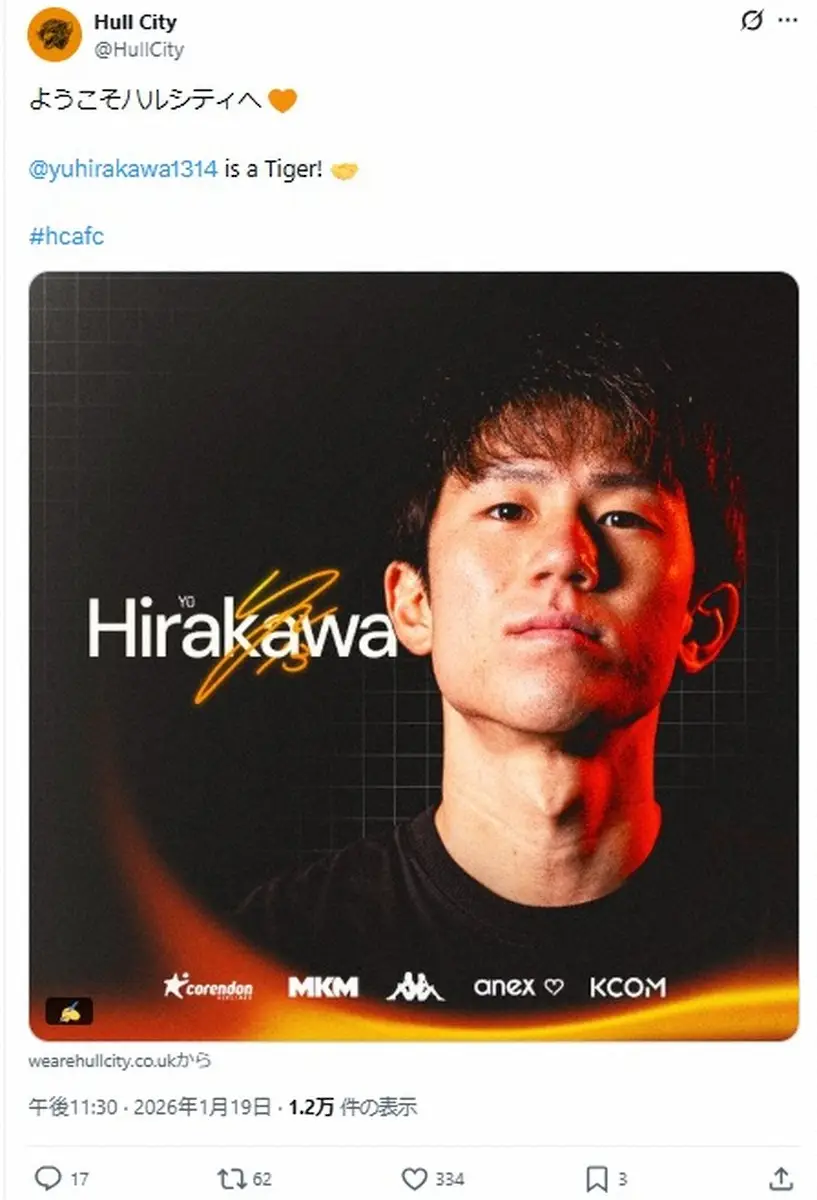 ハルの公式サイトから Photo by スポニチ FW平河悠がハルに期限付き移籍 同じイングランド2部ブリストルCから、昇… ギャラリーで見る この記事のフォト 2026年01月20日の画像一覧 もっと見る 2026年01月20日の画像をもっと見る