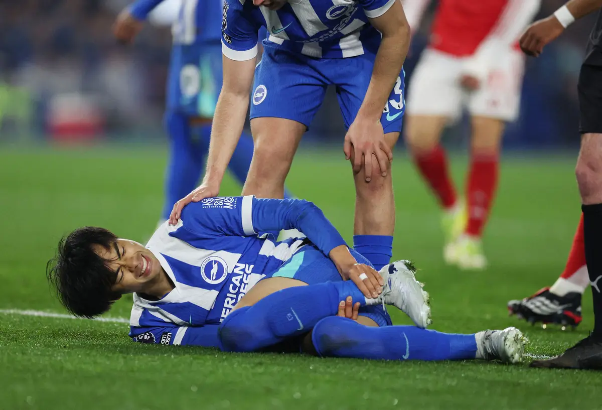 左足首負傷の三笘がプロテクターと松葉づえ 「しばらくスター・ウインガー欠くことになる」との報道も
