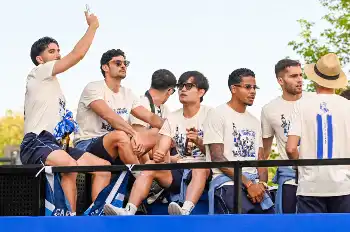 市庁舎での祝賀会では、司会の同僚から口が達者な性格をいじられた後にマイクを握った。「僕はあまり話すのは好きじゃない。ピッチの上で語る方が好きだからね」と切り出し、「今日は僕の人生で最高の日だ。最高に楽しもうぜ!みんなありがとう。さあ行くぞ!」とスラングも用いて最高潮に盛り上げた。