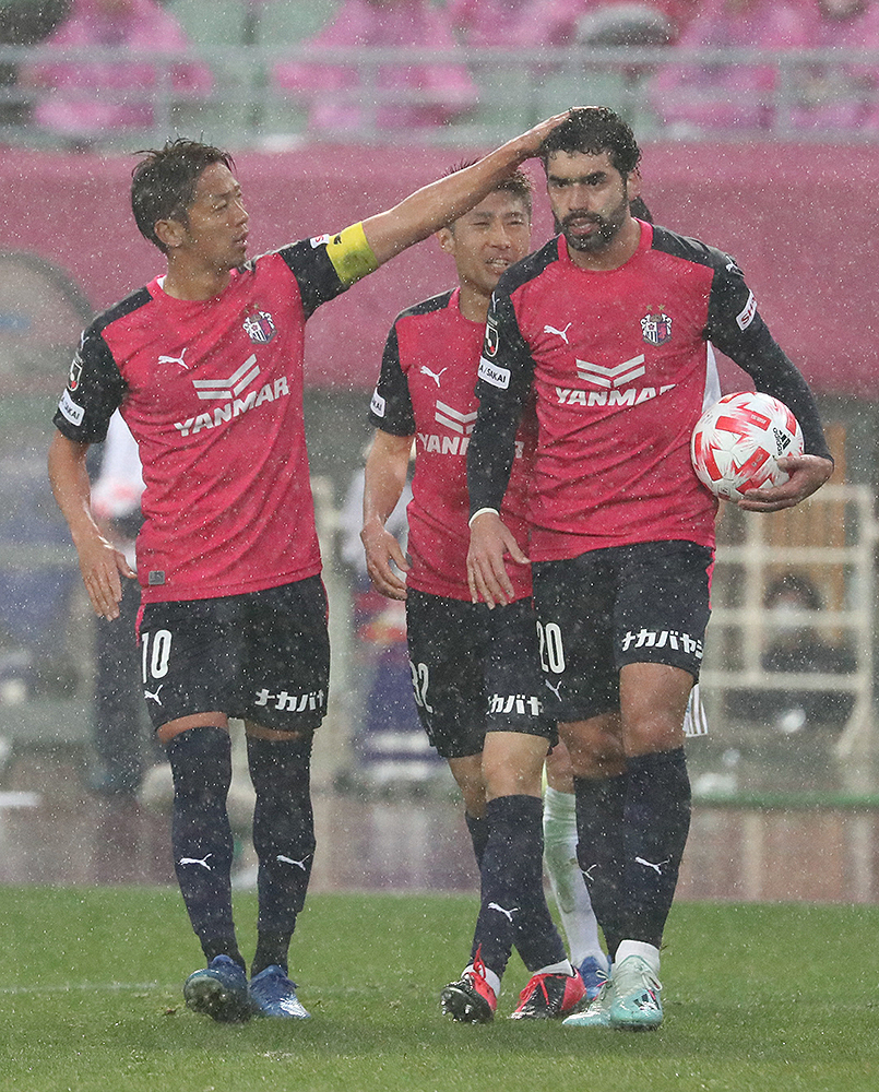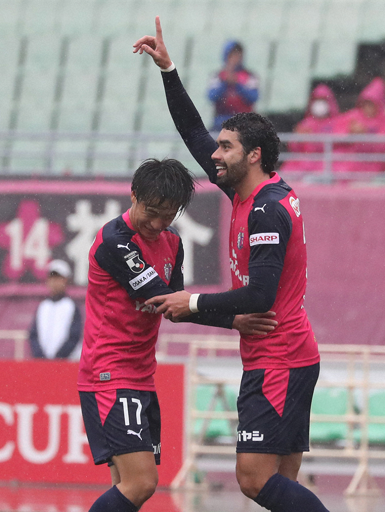 <C大阪・松本>前半8分、同点ゴールを決めポーズを決めるC大阪・ブルーノ メンデス(右)