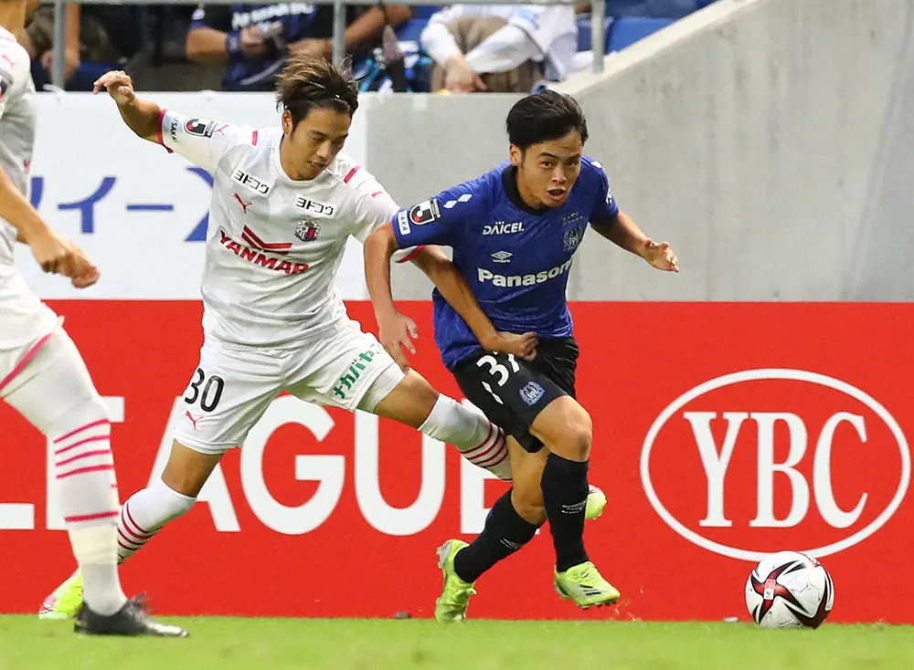 <G大阪・C大阪>前半、競り合うC大阪・喜田(左)とG大阪・山見(撮影・後藤 大輝)