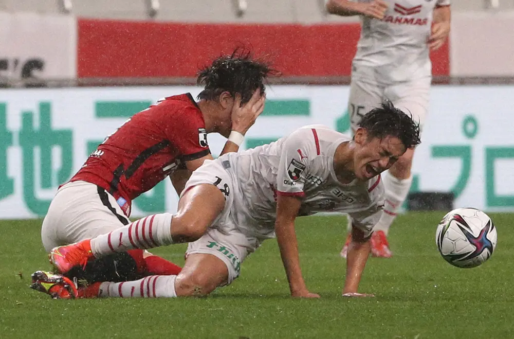 <浦和・C大阪>前半、倒されるC大阪・西川(右)(撮影・西海 健太郎)