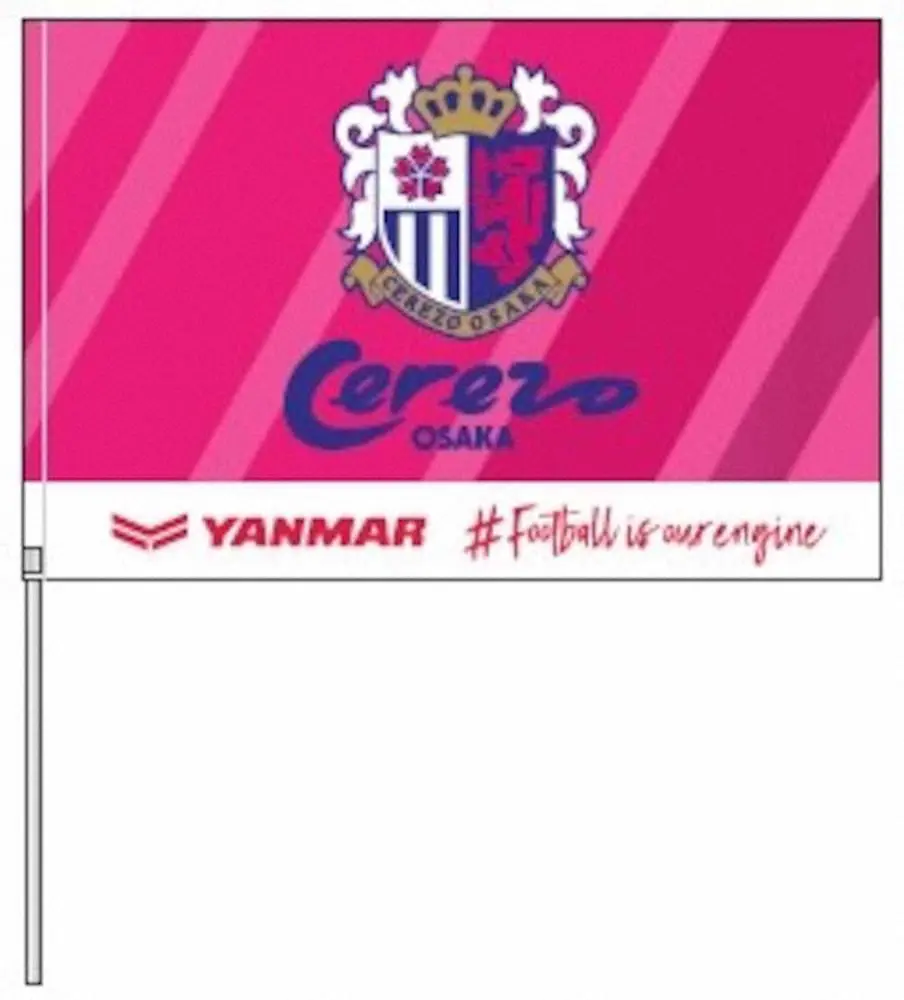 当日、ヨドコウ桜スタジアムの各入場ゲートにて、来場者全員にオリジナルフラッグ=写真=がプレゼントされる(ビジター席を除く)。セレッソのチームカラーに大きく描かれたエンブレムと、「YANMAR #Football is our engine」がコラボしたオリジナルフラッグだ。