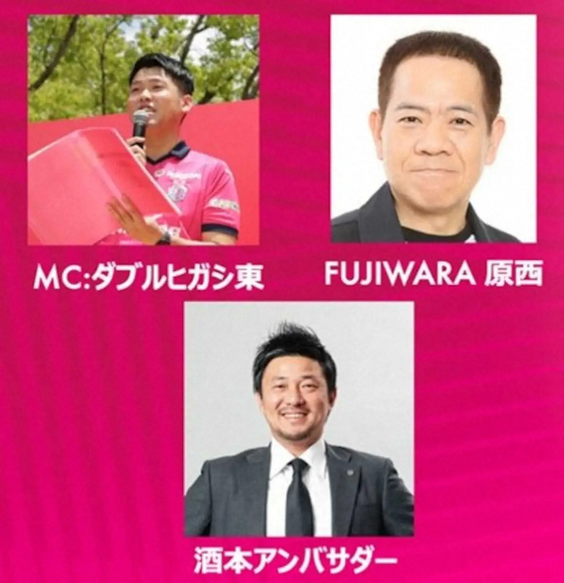 1部では、12時30分から堺チアリーディングクラブがパフォーマンスを披露。2部では、13時からメインMCダブルヒガシ東によるオープニングトーク、さらにゲストとしてFUJIWARAの原西が登場し、ネタを披露する。さらに13時25分からは酒本憲幸アンバサダーも出演するなど、スタジアム場外でも楽しいイベントが盛りだくさんだ。