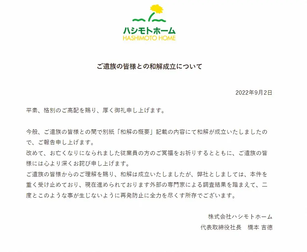公式サイトには「今般、ご遺族の皆様との間で別紙『和解の概要』記載の内容にて和解が成立いたしましたので、ご報告申し上げます」と報告し、概要文書を掲載。亡くなった従業員は顧客から信頼を得て優秀な勤務成績を上げていたとし、恒常的なパワハラを認めた。