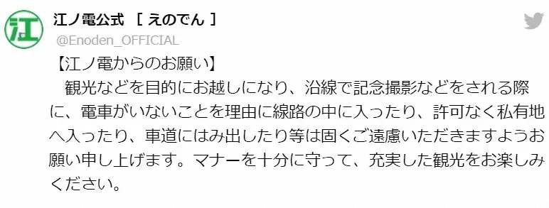 写真スポットが多く点在する路線沿い。江ノ電は過去にも公式SNSで「観光などを目的にお越しになり、沿線で記念撮影などをされる際に、電車がいないことを理由に線路の中に入ったり、許可なく私有地へ入ったり、車道にはみ出したり等は固くご遠慮いただきますようお願い申し上げます。マナーを充分に守って、充実した観光をお楽しみください」と注意を呼びかけている。