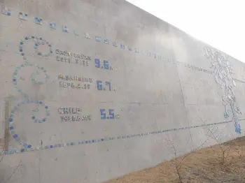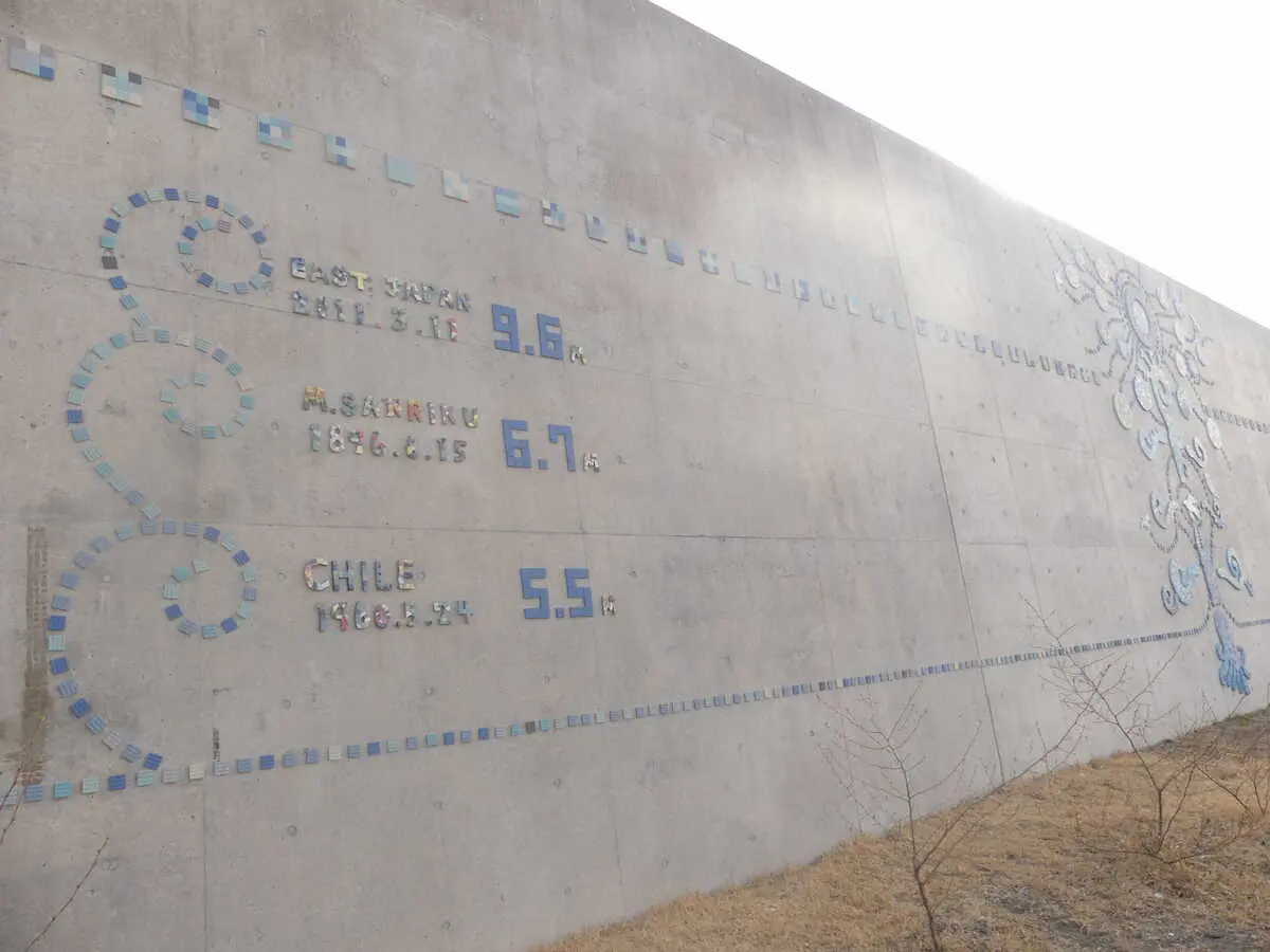 大船渡駅近くにある防潮堤に飾られたモザイクタイルアート。過去の大地震で襲った津波の高さも分かるようになっている(撮影・安田健二)