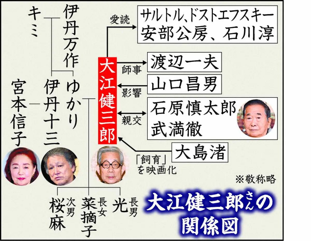 愛媛・松山東高から東大に進み、同大文学部仏文科在学中の57年に作家デビュー。翌58年に「飼育」で芥川賞を受賞した。23歳だった。松山東高の同窓には、のちに映画「マルサの女」などでメガホンを取る伊丹十三さんがいた。60年に結婚した妻ゆかりさんは伊丹さんの妹だった。