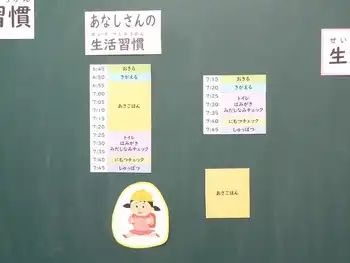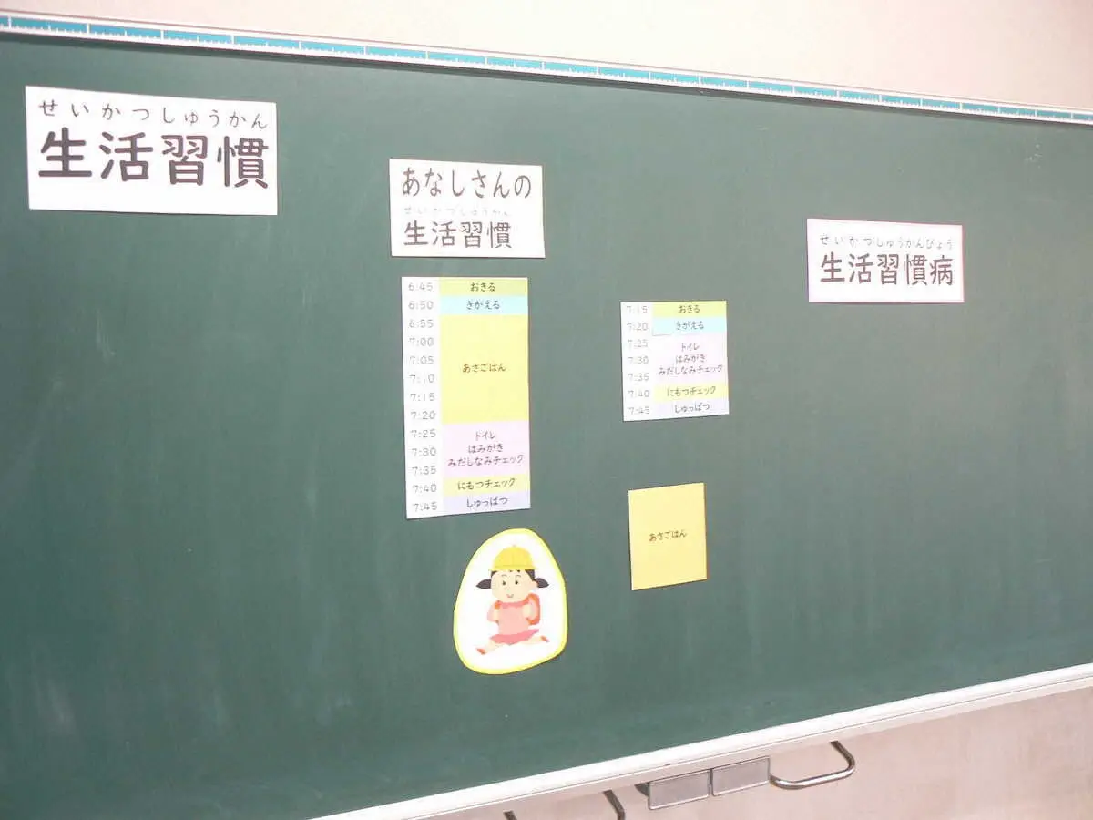 「黒板(詳細は写真を)みてください。この枠に入りません。あなしさんは仕方がないので、朝ご飯を食べず、お茶だけ飲んでいくことにしました。あなしさんは就寝時刻が遅くなったことで、朝起きる時間が遅くなり、朝ご飯をたべることもできませんでした。このように生活習慣はそれぞれつながっています。できるだけ普段の生活習慣を守ることが大切です」