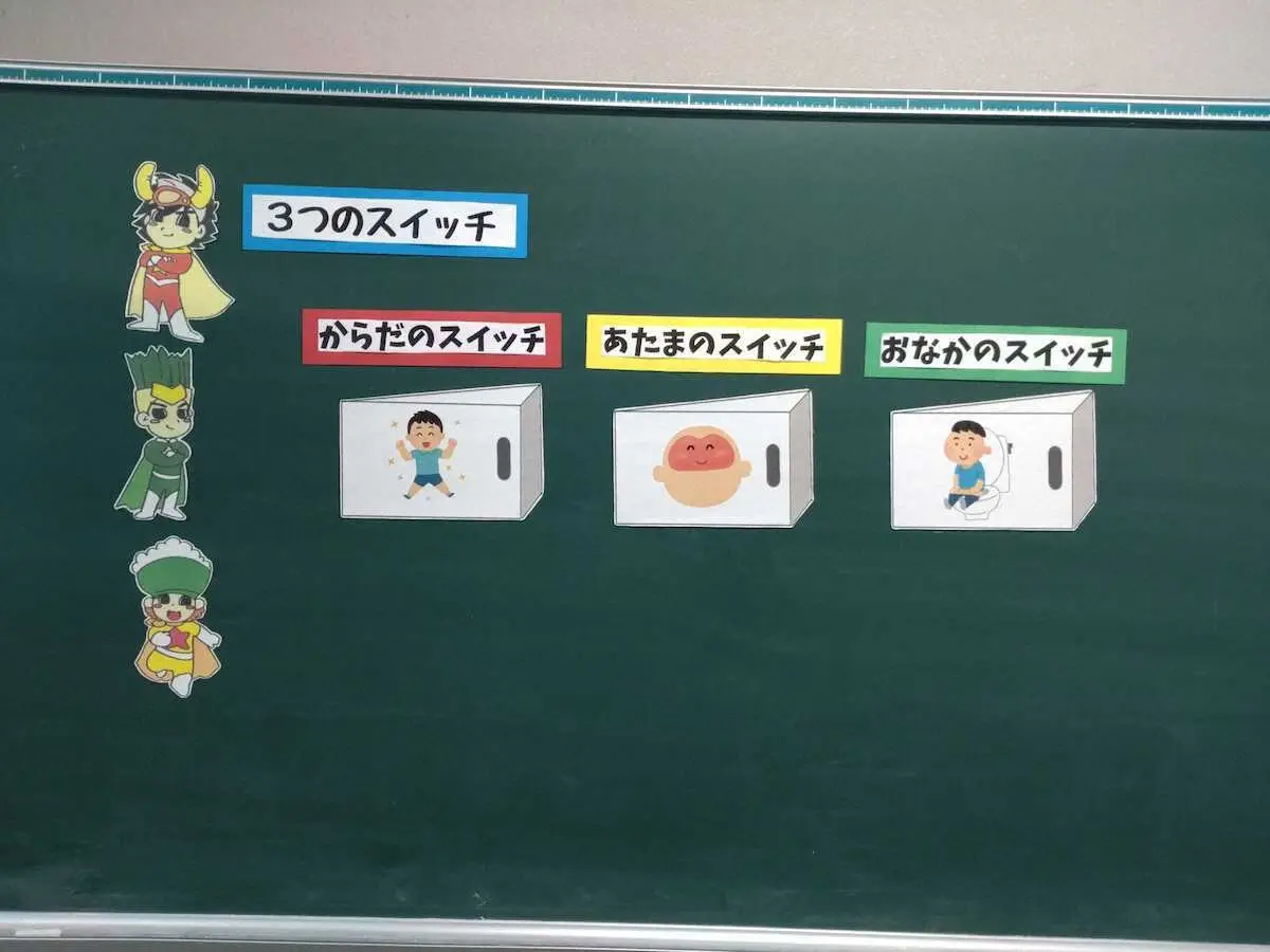 皆さんこんにちは。穴師小学校で保健の先生をしている橋田です。前回は食べ物が赤、黄、緑の3色に分けられるということを、穴師小学校オリジナルキャラクター、食べ物ヒーローのアナシンジャー(写真)、ミートレッド、ライスイエロー、ベジタブルグリーンを使って説明しました。