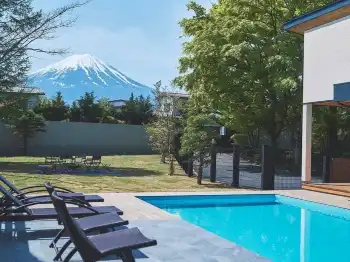 3位の「ヴィラ・セゾン・フジ」はプールでくつろぎながら富士山を眺められる贅沢な施設。ドッグランもあるため、ペット同伴も可能だ。(https://villa-saison-fuji.com/)