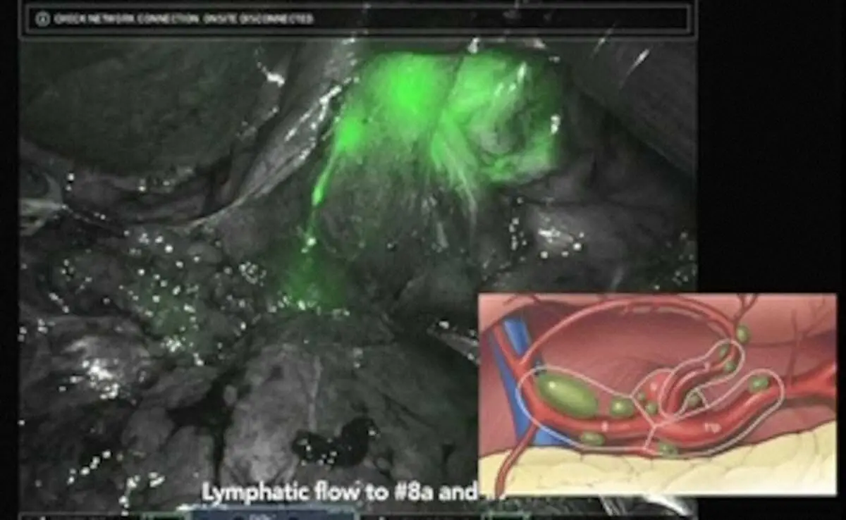 胃がんの周囲にICGを注射すると、このようにリンパ節への流れを観察できます