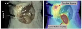 我々が開発しているのは、特定の分子をターゲットにする分子標的蛍光造影剤です。膵臓がんの一種に、神経内分泌腫瘍というものがあります。通常の膵臓がんである膵管腺がんよりも進行の速度はゆっくりであることが一般的ですが、発見が遅れれば肝臓やリンパ節への転移を起こします。Apple社の創業者、スティーブ・ジョブズさんが命を落としてしまった病気です。神経内分泌腫瘍はそのほとんどが、SSTR2というホルモン受容体の一種が多く存在しているという特徴に着目し、SSTR2をターゲットとした蛍光造影剤をテキサス大学の研究室と共同で開発しました。ネズミでの実験ではこのように腫瘍を光らせることに成功し、現在はFDA(米食品医薬品局)の認証が下り次第、実際の患者さんでの臨床試験が始まる予定です。