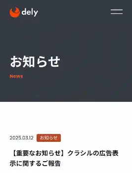 delyはこの日、公式サイトに「クラシルの広告表示に関するご報告」と題したリリースを掲載。「このたび、一部の広告に関し、不適切な内容が表示されているとのご指摘を受け、事実確認を行いました。その結果、該当の広告を特定し、速やかに削除対応を完了いたしました」と問題となっていた広告の削除対応をしたと報告した。