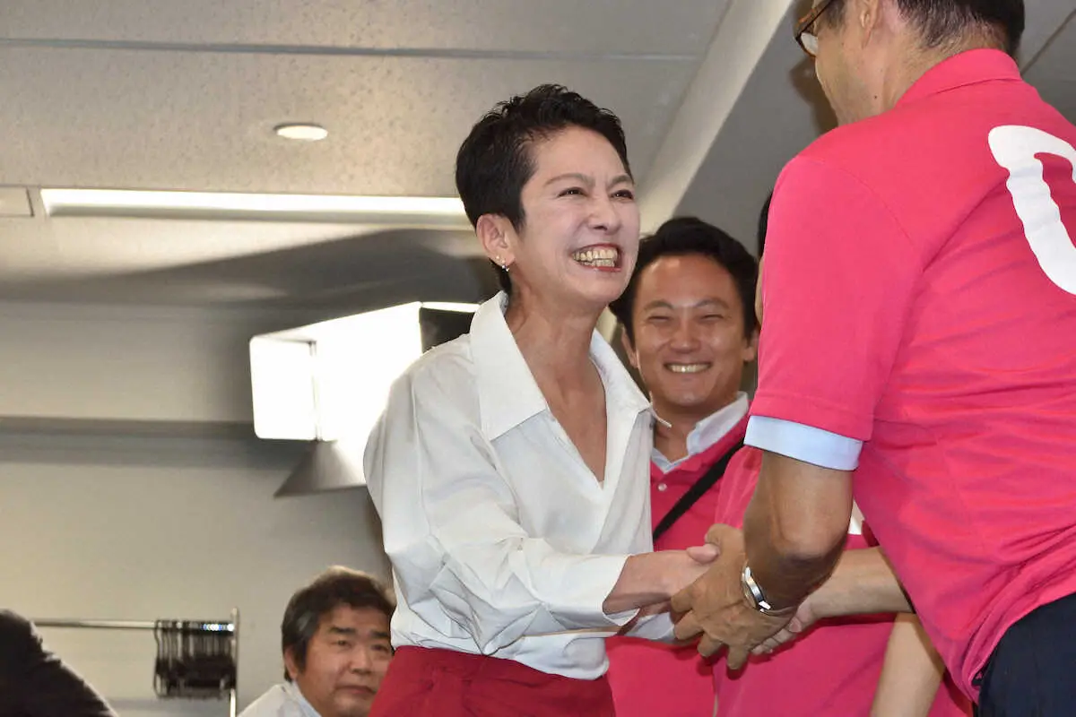 参院選当確を受け、支援者と笑顔で握手を交わす立憲民主党の蓮舫氏 (撮影・小田切 葉月)