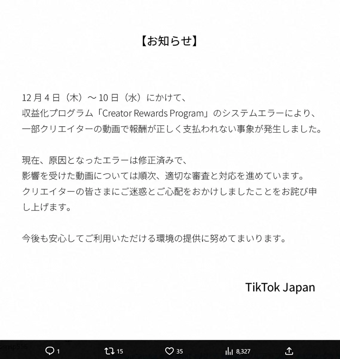 お知らせとした文書を公開。「12月4日(木)~10日(水)にかけて、収益化プログラム「Creator Rewards Program」のシステムエラーにより、一部クリエイターの動画で報酬が正しく支払われない事象が発生しました」と報告した。