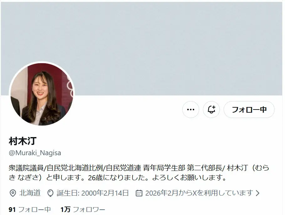 2000年生まれの村木氏は比例北海道ブロックから立候補し、全国最年少で初当選。18日に召集された第221特別国会で66人の“高市チルドレン”の1人として初登院し、「20代の国会議員はまだまだ少ない。若い世代の当事者として国民の声を聴き、届けたい」と意気込みを語った。