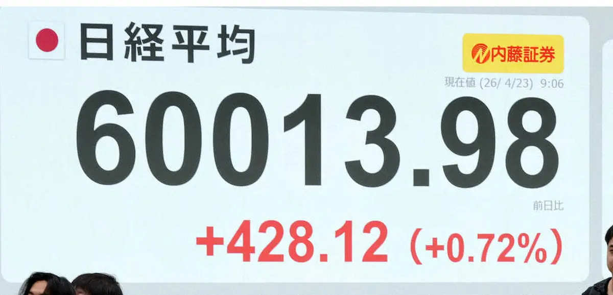 23日の東京株式市場は日経平均株価(225種)が続伸して始まり、一時初めて6万円を突破した。前日の米国市場でハイテク株が上昇したことから、平均株価への影響が大きい人工知能(AI)や半導体の関連銘柄の一角が買われ、昨年10月の5万円超えから約半年で大台を更新した。ただ次第にいったん利益を確定する動きが強まり、下落して取引を終えた。