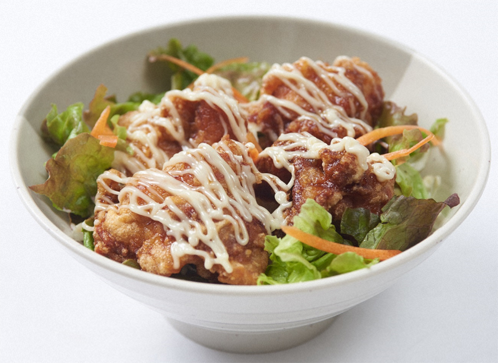 少し手の込んだ料理を食べることができるという理由からバスケ部員の多くも利用する学食で、学生の活力をチャージする「唐マヨ丼」はリピーター続出の人気メニュー。たっぷりの野菜の上にボリュームのある唐揚げが並び、しっかり染み込んだしょう油の下味とマヨネーズのハーモニーが食欲をそそる。午後からの授業や部活動でのハードな練習に取り組む学生の体を支えている。