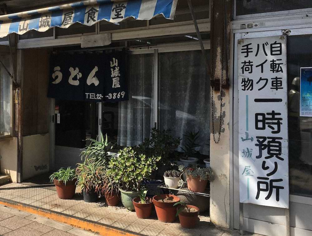 「山城屋食堂」。暖簾(のれん)には「うどん山城屋」、路上看板には「飲食店山城屋」。経験上、店名のこうした小混乱は、長く続く飲食店の特徴で、ボク好みの店である可能性が高い。三角の路上看板が、とても可愛い。自転車バイク手荷物の一時預かり所も兼ねているのも面白い。
