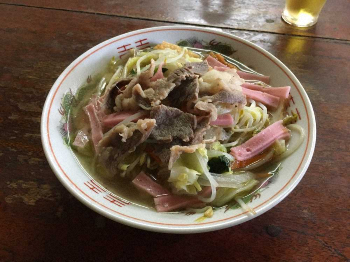 それほど待つことなく出てきた。豚骨スープで、白菜、もやし、かまぼこ、ちくわなどと肉を炒めたものがのっている。驚いたのは、その肉が牛肉であることだ。面白い。