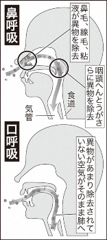 乾燥した空気をそのまま吸い込むのも良くないんですって。「粘膜が乾くと抵抗力が落ちてインフルウイルスが侵入しやすくなる」そうです。鼻呼吸なら、冷たい空気でも鼻腔(びくう)で体温と同等まで温度が上昇するというデータもあります。
