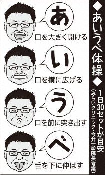 ではどうすれば口呼吸の人が鼻呼吸に転換できるのでしょうか。口呼吸は、口が終始開きがちであることが要因のひとつ。口をしっかり閉じているためには、口周辺の筋肉を鍛える必要があります。図<2>を見てください。「あいうべ体操」という口周辺の筋肉トレーニング法が知られています。声を出しても出さなくてもいいそうです。器具も要りませんから、いつでもどこでもできますね。私は睡眠時「ネルネル」というテープを口に貼って口呼吸予防してます。これオススメです。