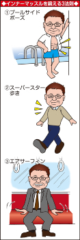 いくら“ちょいデブ”が死亡リスクが低いといったって、お父さんたちはちょっと気を緩めれば、すぐにおなかが出てくるもの。かといって運動はなあ、時間もないし。そこで南雲先生から、器具もジムも必要ない「インナーマッスルを鍛える3法則」を教えていただきました。