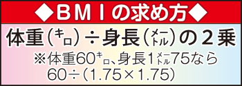 「BMI」ご存じですよね。「Body Mass Index(ボディー・マス・インデックス)」の略で、世界共通の肥満度の指標。図<1>の計算式で求められます。皆さんも計算してみてください。一点だけ注意。身長は「メートル」なので、175センチなら1・75でね。出た数字を図<2>に当てはめてみてください。18・5から25の間のあなた、体重は標準です。25以上なら肥満気味。35を超えると高度の肥満。理想は22といわれています。