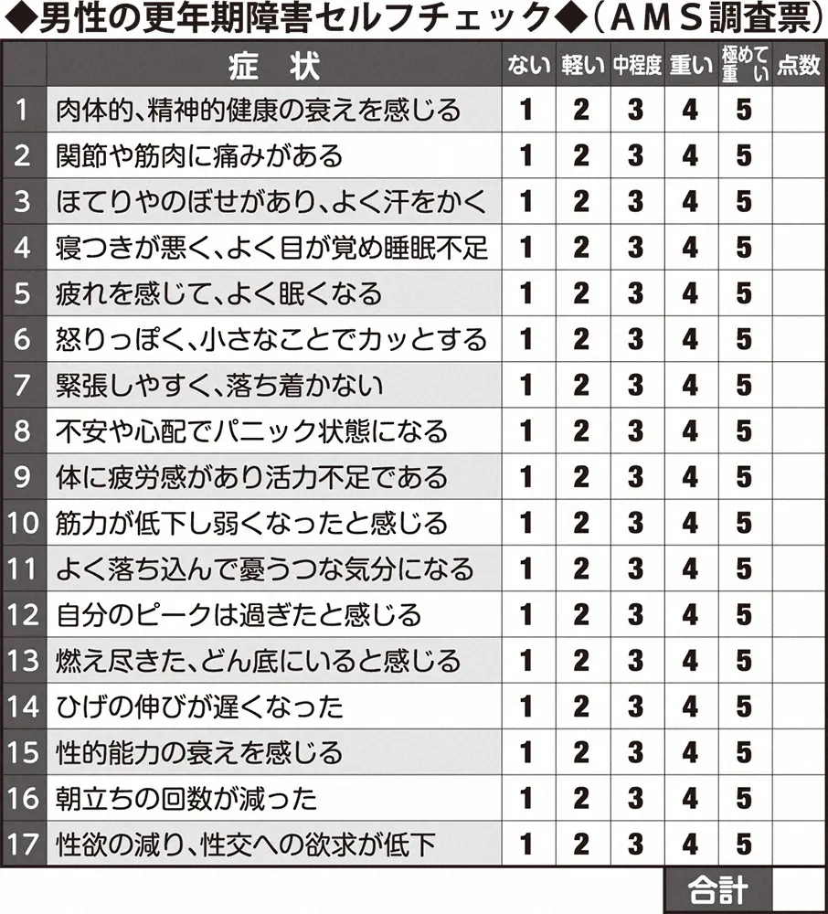 テストステロンが大きく影響する男性更年期障害のセルフチェックを掲載します。スコアが50点以上の場合、医師の診察が勧められています。日本メンズヘルス医学会の公式サイトに専門医がいる病院の一覧があります。参考にしてください。