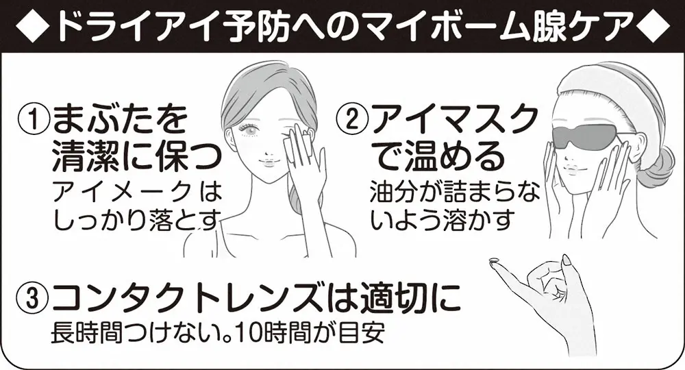 「2つ目は、アイマスクで目を温めること。油ですから、熱を加えれば溶けだします。開口部の通りをよくするのです。市販のアイマスクを活用しましょう。3つ目は、コンタクトレンズを長時間つけたままにしないこと。一般的には10時間以内が目安といわれています。コンタクトレンズは、基本的に、医師による処方箋がないと購入できません。コンタクトレンズの使用は、それだけ慎重にならないといけないということです」