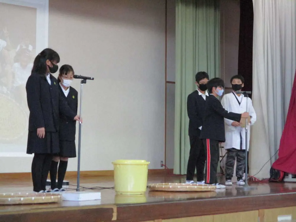梅樽や梅のザルを見せながら、梅干しの作り方を紹介しました