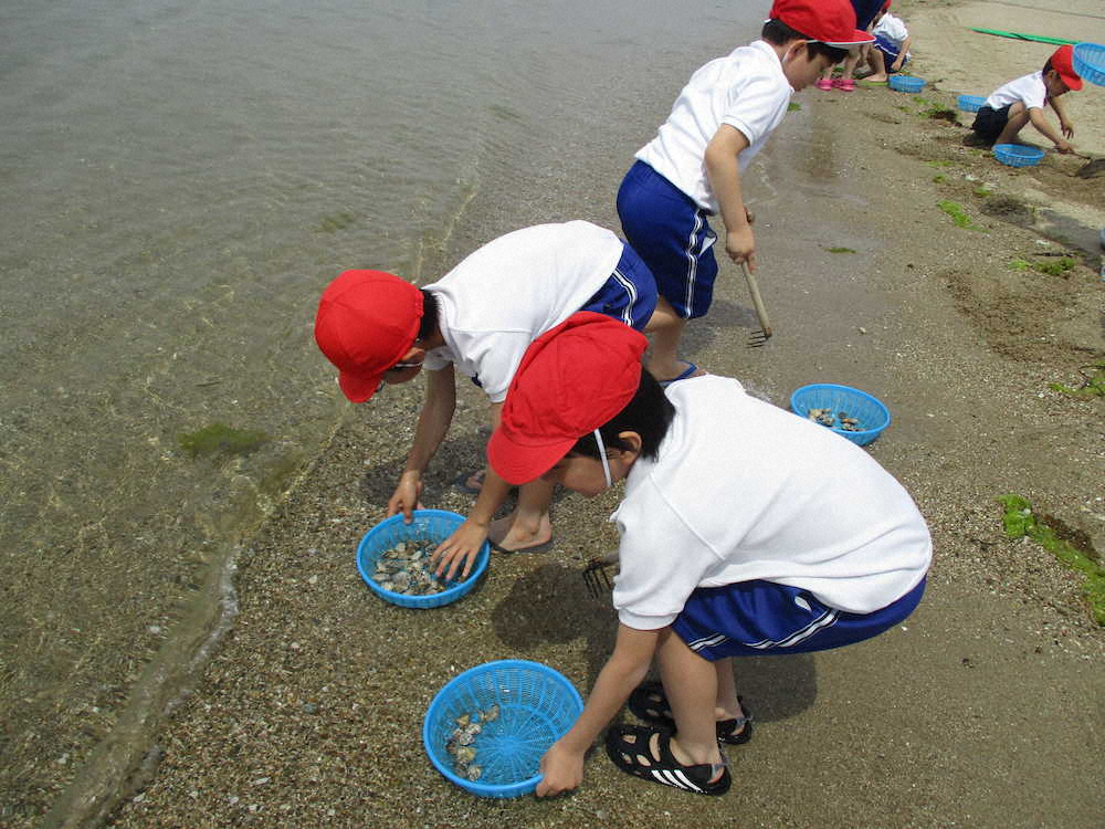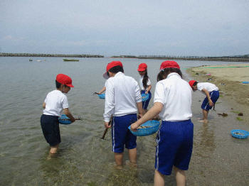 高く大きな空と潮風にあたりながら潮干狩りの体験学習です。採取の方法や、貝の区別などを教えていただき、みんなでチャレンジします。最初はこわごわ採取している児童もいますが、すぐに笑顔に変わります。楽しく、すてきな体験です。終了後はお土産用の貝と交換してもらえる豪華な特典付きです。