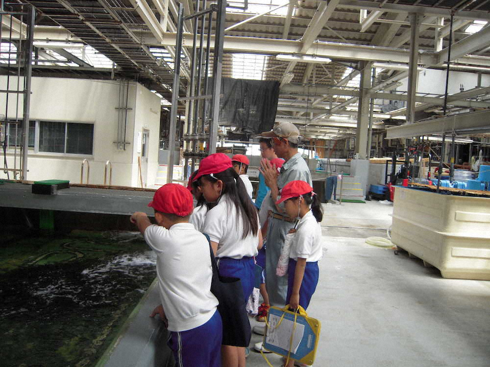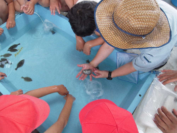 海の生き物の多様性や環境の大切さをわかりやすく、ていねいに教えてもらうだけでなく、深日(ふけ)漁業協同組合の方々にお世話になり、毎年ひらめの稚魚の放流体験をさせていただいています。