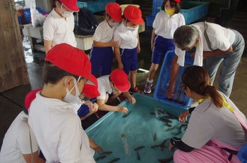 子どもたちの目の前にあるプールの中には、ガシラ、ナマコ、フグ、カワハギなど、たくさんの魚が泳いでしました。