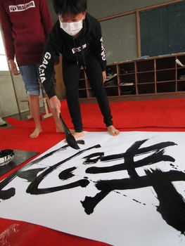 子どもたちも普段の「習字」ではなく、「書道」として各自が半紙に自由な作風で書きました。