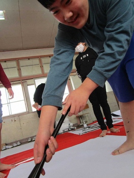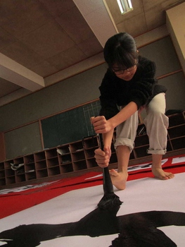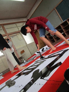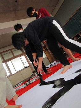 3年前から紫苑先生をお招きして、子どもたちの目の前で大きな紙に書道パフォーマンスをしていただいています。