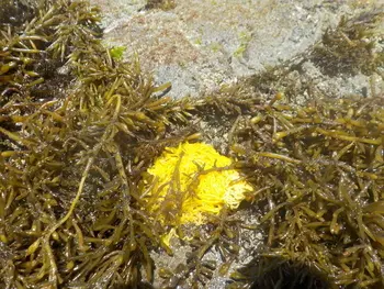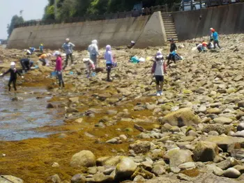 「みんな、この黄色いのんアメフラシの卵やで」と睦谷さんは足元の黄色い塊を指さしています。