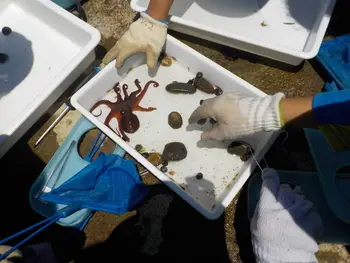 大阪府立環境農林水産総合研究所水産技術センターのご協力を得て、同センター職員の睦谷(むつたに)さんが、強力助っ人として、深日小の学習をサポートしてくれた磯遊びの続編です。