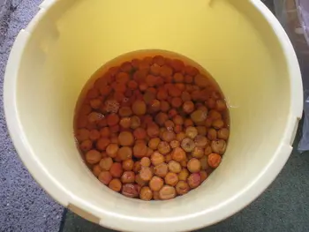 まず、梅の漬け樽に10キロの梅を計って入れます。